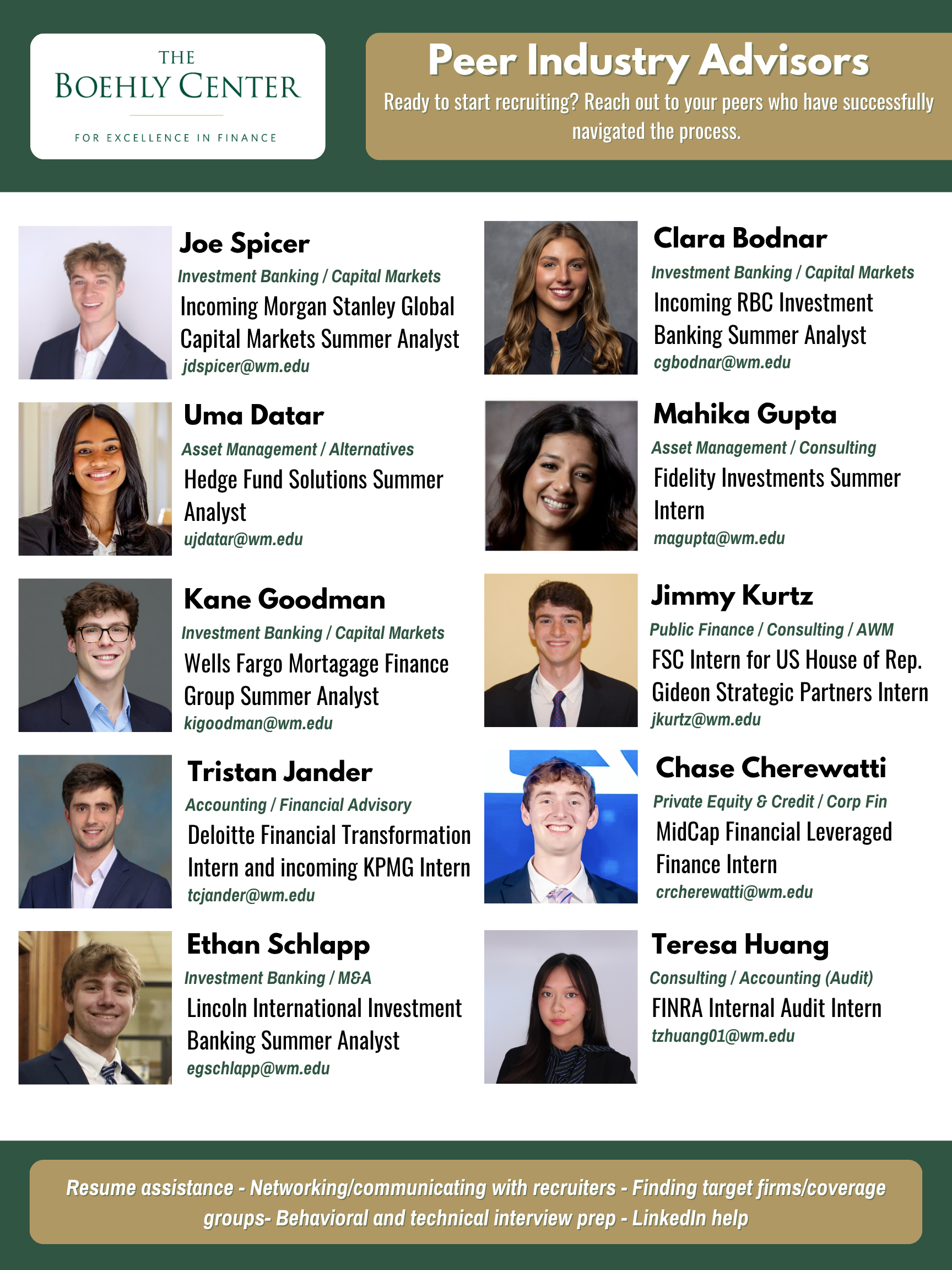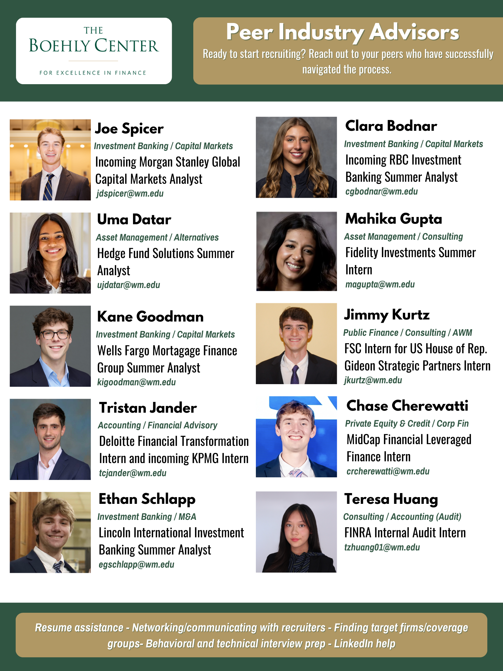 Have an interest in different areas of finance? Schedule a meeting with one of our Peer Industry Advisors for help with resume assistance, networking & communication with recruiters, finding target firms & coverage groups, interview prep, and behavioral & technical interview simulation. Learn more about the Peer Industry Advisors and how to schedule an appointment here!